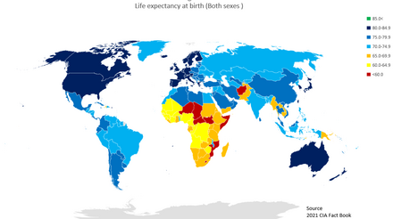 Данные Группы Всемирного банка за 2021 год[2][3][4]. Приведены только страны с населением более 50 тысяч человек. Значения в таблицах округлённые. Все вычисления проведены на неокруглённых данных, поэтому, вследствие нюансов округления, в некоторых местах возникли кажущиеся нестыковки индикаторов размером в 0,01 года.