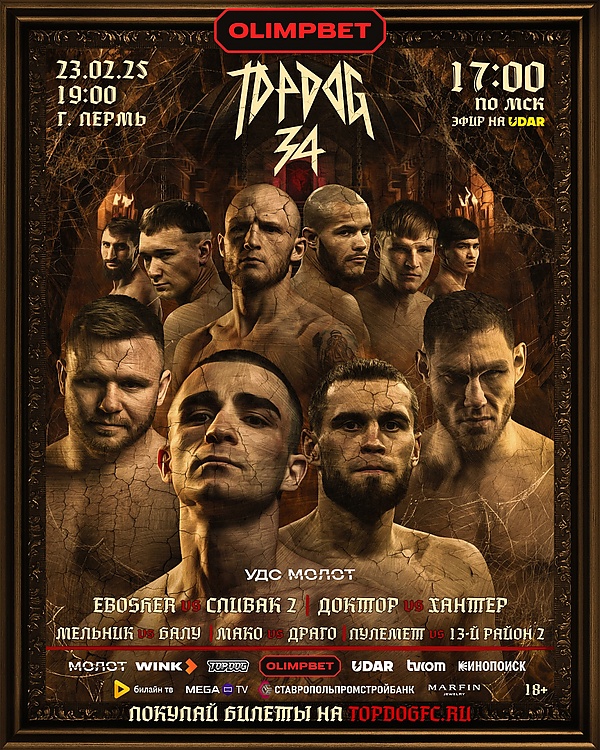 23 февраля 2025 года в городе Пермь, состоялся 34 номерной турнир Top Dog FC. Впервые хедлайнерами турнира стали бойцы легчайшей весовой категории (до 59 кг). В главном бою в реванше сошлись Николай Терехов и местный боец из Перми — Дмитрий Спивак, который и победил в данной схватке техническим нокаутом (остановкой врача) в перерывах между первым и вторым раундами. Терехов получил травму ноги после нокдауна, в котором побывал в конце первого раунда. В со-главном бою известный кулачный боец Ильнар Ишимбаев одержал первую победу на Топ Доге, победив топового средневеса — Тимура Акаимова решением судей. В 4-м бою андеркарда, андердог схватки Борис «Жрец» Манаенков нокаутировал фаворита Рамазана «Headhunter» Курбанова во втором раунде, при том то вышел на бой с аллергической реакцией, и с отёком Квинке в области шеи[2][3][4].