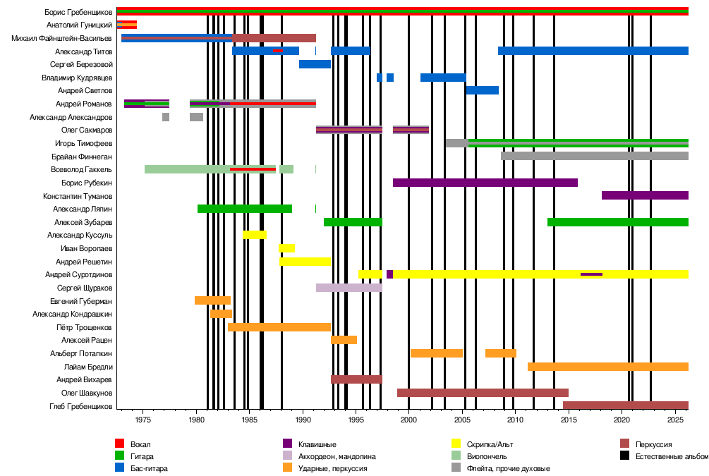 - Борис Гребенщиков (БГ) — вокал, гитара, губная гармоника, клавишные, слова, музыка (с 1972)