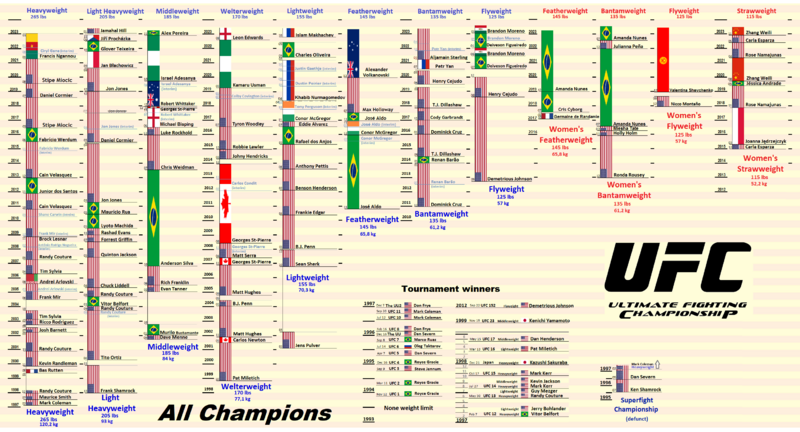 Во время первых турниров UFC в США смешанные боевые искусства не признавались спортом, а в самих соревнованиях не было весовых категорий. Вместо привычной модели чемпионства объявлялся победитель турнира[2]. В ответ на критику сенатора Джона Маккейна, который способствовал запрету турниров в 36 штатах, UFC начала сотрудничать с атлетическими комиссиями и в 1997 году ввела в правила весовые категории[3].