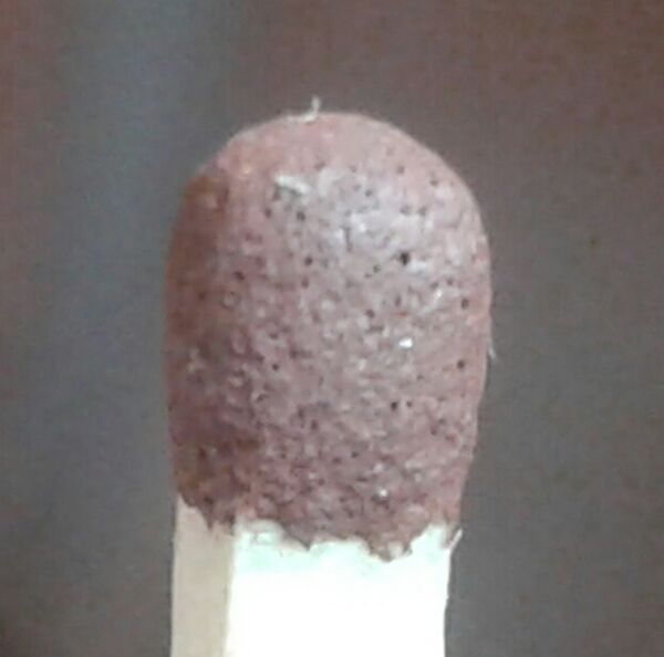 Намазка спичечного коробка, о которую трут спичкой при её поджигании, тоже представляет собой взвесь порошкообразных веществ в растворе клея. Но состав порошкообразных веществ несколько иной. В их число входит сульфид сурьмы (III) и красный фосфор, который при трении головки о намазку переходит в белый фосфор, мгновенно вспыхивающий при контакте с воздухом и поджигающий головку. Чтобы при зажигании не загорелась вся намазка, частички красного фосфора разделены плохо горящими веществами — железным суриком, каолином, гипсом, молотым стеклом[1].