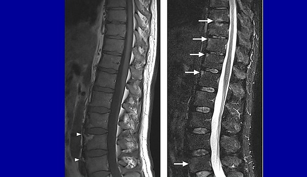 Спондилодисци́т — это инфекционное воспаление, поражающее позвонки, межпозвонковые диски и прилегающие структуры. При поражении нервных корешков могут возникать боли в ногах и неврологические нарушения. Ранняя диагностика и лечение этого заболевания крайне важны для благоприятного исхода, но зачастую они откладываются из-за неспецифических симптомов и отсутствия лихорадки.