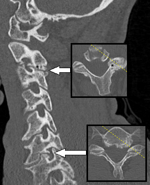 При спондилёзе костная ткань суставов разрастается, образуются остеофиты, то есть дополнительная костная ткань (по мере нарастания костный вырост распространяется к соседнему позвонку, тогда как от соседнего позвонка образуется такой же вырост, в некоторых случаях окостенение начинается на уровне межпозвоночного диска). В особо тяжёлых случаях наступает сращение позвонков, от чего страдают сосуды, нервы и мышечная ткань, а также близлежащие органы[4].