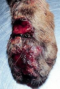 У животных возбудитель споротрихоза попадает в организм через травмированную кожу (раны, ссадины). Болеют главным образом лошади, мулы, собаки и кошки. Течение болезни хроническое. Поражаются кожный покров и сосуды лимфатической системы в области шеи и конечностей (у лошадей). Образуются пустулы, язвы, абсцессы. Возникающие на коже узлы, вначале плотные, безболезненные, размягчаются, затем через свищевые ходы вытекает гной. Впоследствии вскрывшийся узел (абсцесс) превращается в язву с приподнятыми краями. У собак узлы, а затем язвы появляются на коже по всему телу.