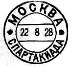 Первым филателистическим материалом спортивной филателии в СССР стал специальный почтовый штемпель с надписью «Москва. Спартакиада», которым гасилась корреспонденция, отправляемая из Чернышевских казарм, третьего Дома Советов (где жили спортсмены) и со стадиона «Пищевик» (где проходили соревнования) в период с 11 по 24 августа 1928 года в Москве в дни первой Всесоюзной Спартакиады, посвящённой первому пятилетнему плану и 10-летию советского физкультурного движения[1][2][3][≡].