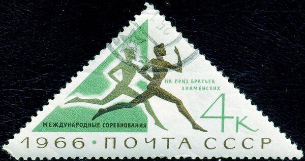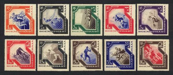 В 1935 году были эмитированы первые советские марки со спортивными сюжетами — серия миниатюр в ознаменование Всемирной спартакиады в Москве[4], которая, тем не менее, так и не состоялась. Автором серии выступил художник В. В. Завьялов[3][5]: