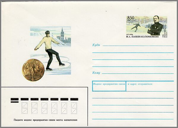 Конверт с оригинальной маркой «125 лет со дня рождения Н. А. Панина-Коломенкина, фигуриста, первого российского Олимпийского чемпиона», Россия, 1996 (ЦФА [АО «Марка»] № 45). Художник Ю. Жуков