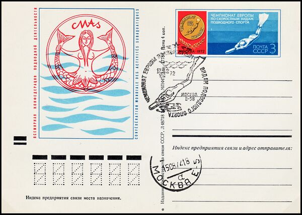 Односторонняя почтовая карточка с оригинальной маркой «Чемпионат Европы по скоростным видам подводного плавания. Москва», СССР, 1972 (ЦФА [АО «Марка»] № 6). Художник Н. Шевцов. Спецгашение: Москва, отделение связи В-58, 13—20.08.1972