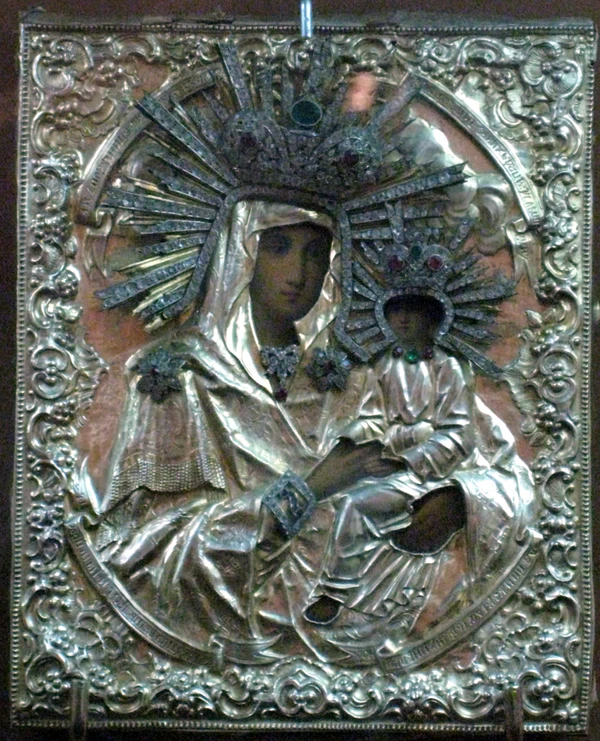 Богородица изображена по пояс, левой рукой держит младенца Христа, который сжимает её правую руку. Икона украшена коронами, что свидетельствует о её малороссийском или белорусском происхождении.