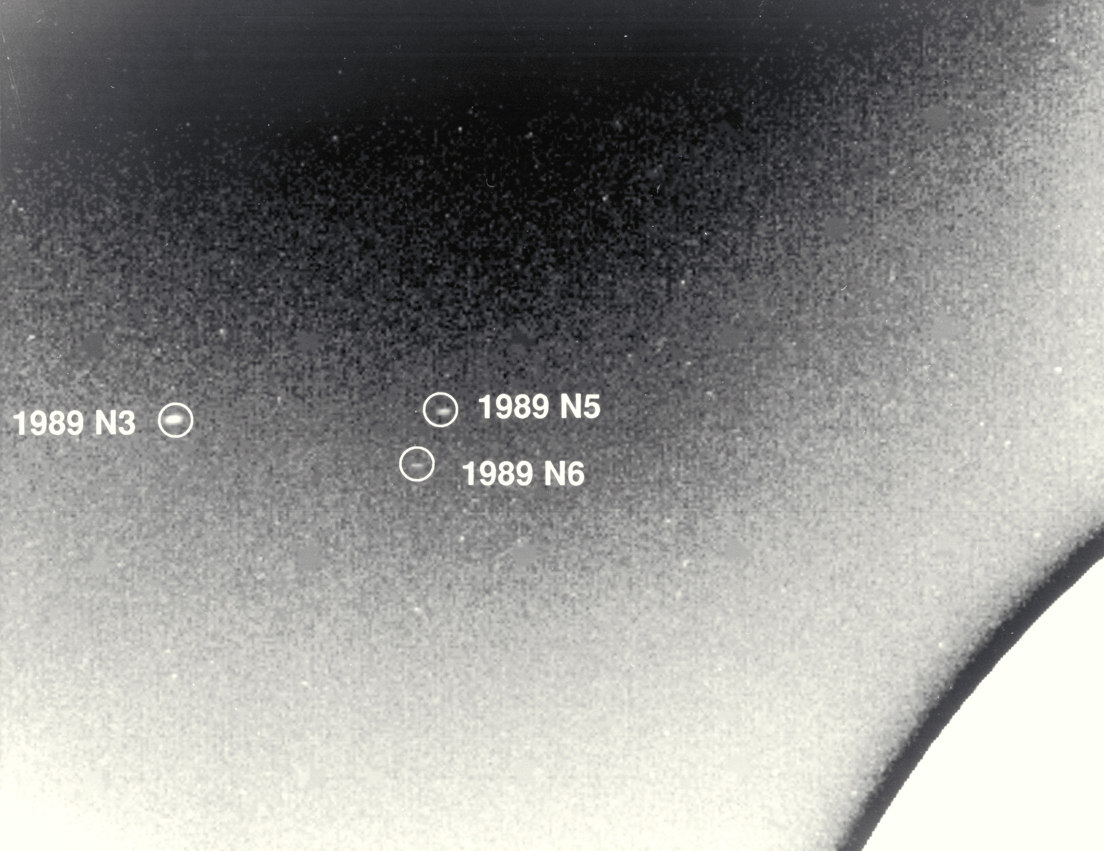 В 1989 по итогам анализа снимков «Вояджера-2» были открыты ещё шесть спутников Нептуна. Все они движутся по круговым орбитам в прямом направлении практически в плоскости экватора планеты. Самый удалённый от планеты спутник, получивший обозначение S/1989 N1, был замечен Стивеном Синнотом в июле 1989 года на снимках, сделанных в середине июня. 3 августа 1989 года было сообщено об открытии ещё трёх спутников: S/1989 N2, обнаруженного Г. Рейтсемой, У. Хаббардом, Л. Лебофски и О. Толеном, а также S/1989 N3 и S/1989 N4, описанных Синнотом. На фотографиях, сделанных в ходе последнего сближения «Вояджера» с Нептуном, Р. Террил заметил два внутренних спутника (S/1989 N5 и S/1989 N6). Названия для новых спутников были утверждены Генеральной ассамблеей МАС в июле 1991 года[2].