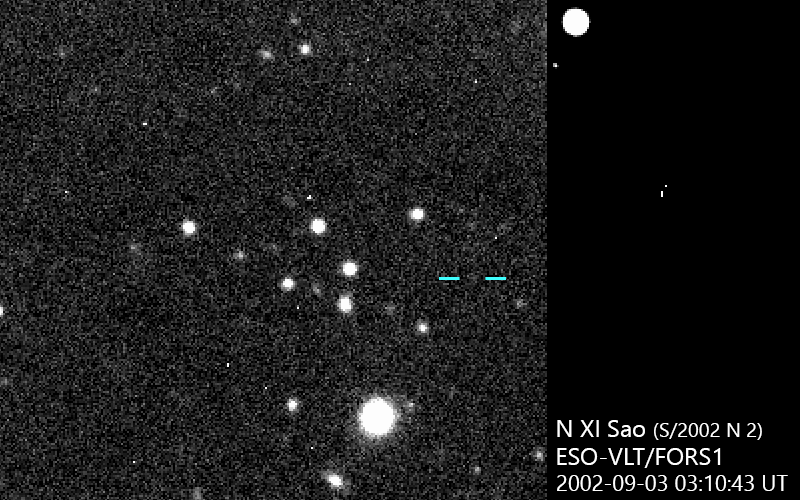| XI | Сао | S/2002 N 2 | 22 239 900 | 0,296 | 48,511 | 2919,4 | 44 | 6,7⋅1016 | 2002 | |