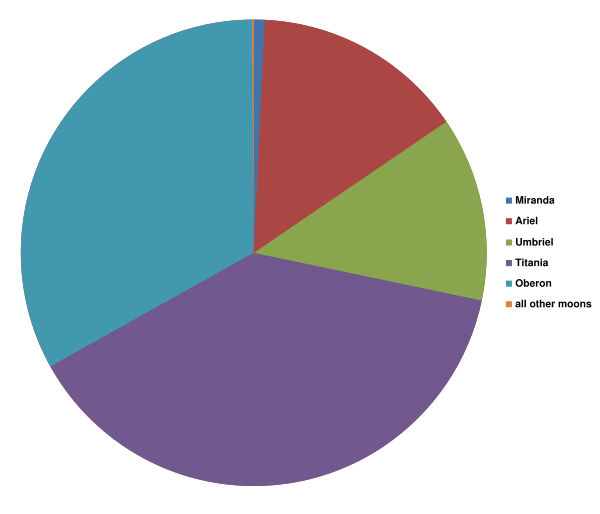 Система спутников Урана наименее массивная среди систем спутников планет-гигантов; совокупная масса всех 5 крупнейших спутников Урана не составит и половины от массы Тритона, седьмого крупнейшего спутника Солнечной системы (масса Тритона составляет около 2,14⋅1022 кг[15], тогда как совокупная масса спутников Урана составляет около 1⋅1022 кг. Крупнейший из спутников, Титания, обладает радиусом в 788,9 км, что меньше радиуса земной Луны, но немного больше, чем у Реи, второго из крупных спутников Сатурна, что делает Титанию восьмым по размеру спутником в Солнечной системе. Уран приблизительно в 10000 раз массивнее, чем его спутники (масса Урана — 8,681⋅1025 кг, масса четырёх самых крупных спутников — 8,82⋅1021 кг[16], массой остальных спутников можно пренебречь).