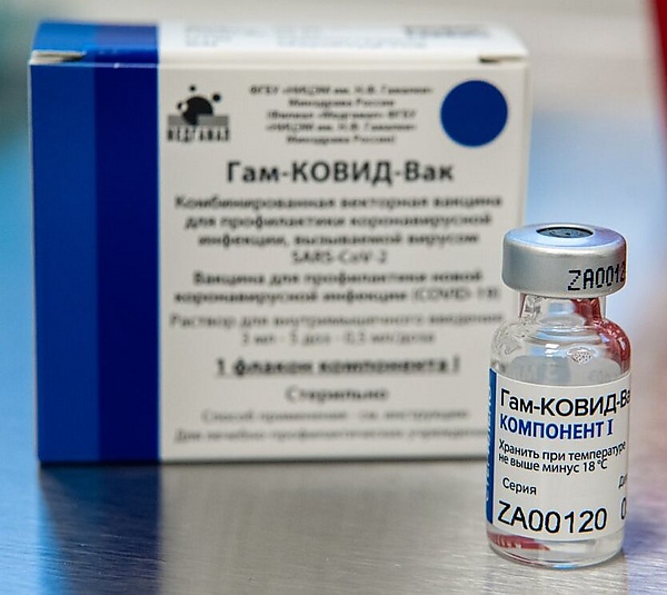 5-дозовый флакон (3 мл) с I компонентом вакцины Гам-КОВИД-Вак производства «BIOCAD» в руках аргентинского медработника в больнице Posadas Hospital в Эль-Паломаре провинции Буэнос-Айрес[380] |