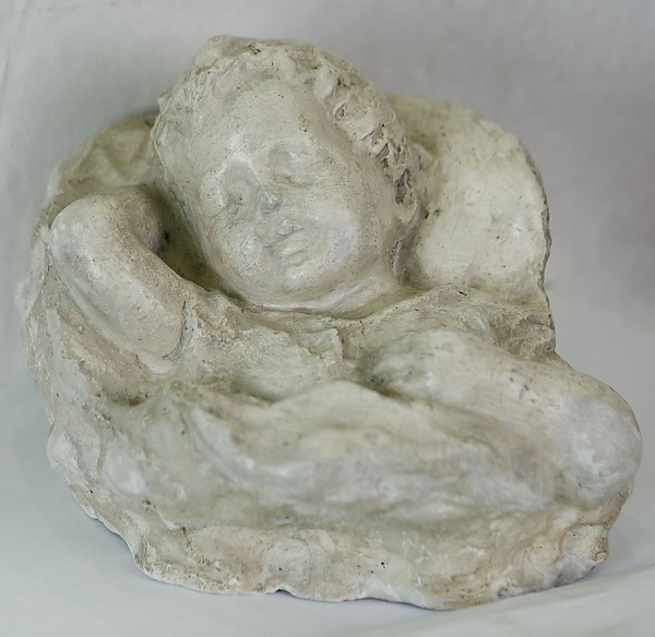 Изделие выполнено из гипса. Использование гипса позволяет создать детализированные формы и проработать текстуры. Техника изготовления включает моделирование объёма и деталей, что помогает передать мягкость образа спящего ребёнка.