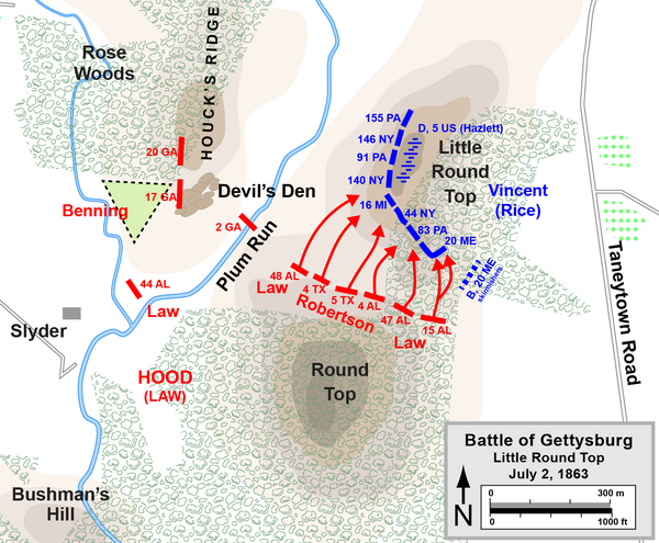 Винсент тут же приказал Джеймсу Райсу, полковнику 44-го Нью-Йоркского полка, вести бригаду на холм и сам помчался туда же вместе со знаменосцем. Они поднялись на холм с южной стороны, и Винсент, спешившись, тщательно изучил всю высоту. Он определил, что наибольшая опасность угрожает холму со стороны Биг-Раунд-Топ и седловины, что террасы на южном склоне удобны для размещения пехоты и что северный склон пока прикрыт корпусом Сиклса. Каменный отрог на южной стороне холма был удобной позицией для флангового полка, а остальные можно было растянуть на север сколько возможно, стараясь состыковаться с крайними левыми полками корпуса Сиклса[19].