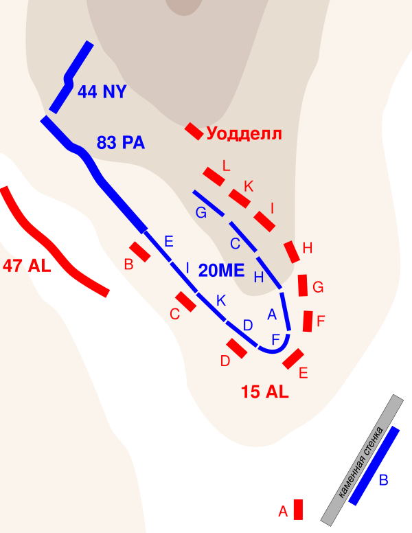 Гарри Пфанц писал, что первая атака южан пришлась на центр линии Винсента — на 44-й Нью-Йоркский и 83-й Пенсильванский полки. Затем боевые действия начались на фронте правого 16-го Мичиганского полка, и только позже (когда подошли два алабамских полка Оатса) начался бой на фронте 20-го Мэнского полка[33]. По версии Стивена Сирса, первая атака пришлась на 44-й Нью-Йоркский, оттуда распространилась на 83-й Пенсильванский полки и далее на 20-й Мэнский. Полковник Чемберлен вспоминал, что первая атака была не особенно яростной. «Огонь был сильный… — вспоминал он, — но в тот момент мятежники старались не столько отбросить нас, сколько перестрелять из винтовок»[34].