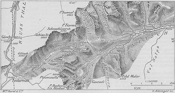 В это время корпус А. Г. Розенберга и бригада Ауфенберга на рассвете выступили из Дисентиса и Тавеча (он же Седрён) в западном направлении, на Урзерн (Андерматт). Вскоре австрийцы повернули на север, чтобы пересечь горы и достичь Мадеранерталя, альпийской долины, которая вела на запад к Амштегу. Для переправы бригада Ауфенберга разделилась на три отдельные колонны, из которых средняя переправилась через перевал Крюцли.