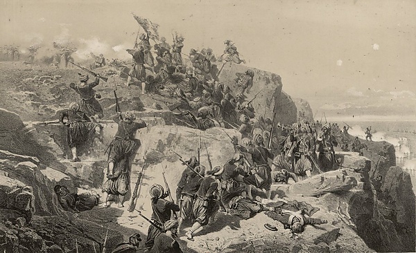 - 2-й батальон Минского полка поменял позицию, выйдя из-под артиллерийского обстрела с моря и развернувшись фронтом к линии французской пехоты, наступавшей со стороны моря. После того, как командир 4-го батальона подполковник Матвеев подвёл своих подчинённых ко 2-му батальону, оба батальона под общим командованием подполковника Раковича (2000 чел.) действовали против поднявшихся вслед за французами турок (6000 чел.)[28].