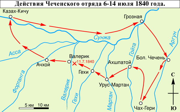 Численность горцев: Лермонтов в письме А. А. Лопухину, а затем в стихотворении «Валерик» оценивает силы противника в 6000—7000 человек[11][12].). С учётом того, что в одной лишь Малой Чечне под предводительством Исы Гендаргеноевского и Ахбердила Мухаммеда находилось 5700 семейств, а набор воинов был доселе невиданный — по 1 человеку с каждого двора — число в 6000 человек не кажется завышенным[13].