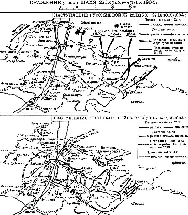К исходу 23 сентября (6 октября) на правом фланге русские войска достигли Шахе, а на левом подошли к передовым позициям противника и завязали за них упорные бои. Японское командование не ожидало наступления русской армии, но, разгадав намерения русского командования, решило вырвать инициативу. 27 сентября (10 октября) японцы перешли в контрнаступление, нанеся главный удар 2-й и 4-й армиями по войскам Западного отряда (17-й, 10-й армейские корпус и подошедший 6-й Сибирский).