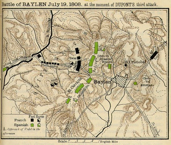 Испанские генералы не замедлили воспользоваться этим. Рединг и Купиньи расположились при Байлене между Дюпоном и Веделем, отрезав их друг от друга. Дюпон, до сих пор ожидавший главный удар противника в Андухаре, наконец оценил опасность своего положения. В ночь с 18 на 19 июля он двинулся от Андухара к Байлену, ещё не осознавая, что его ждёт.