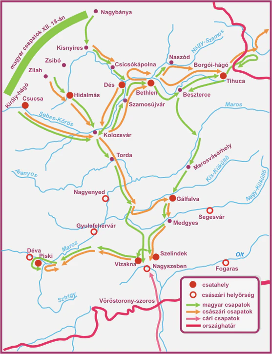 Бем со свойственной ему решимостью сразу же перешел в наступление, разбил и вытеснил имперские войска из Северной Трансильвании и двинулся на юг, чтобы захватить Сибиу, центр имперского сопротивления в Трансильвании. Венгерские войска подошли к Сибиу 21 января, но после нескольких безуспешных атак поняли, что имеющихся в их распоряжении сил недостаточно для взятия города. Так как закончились боеприпасы, армия отступила сначала к Селиндеку, а затем к более защищенной Визакне (Зальцбург, Окна-Сибиулуй), отбивая атаки преследующего Антала Пухнера, командующего австрийскими войсками в этом регионе.