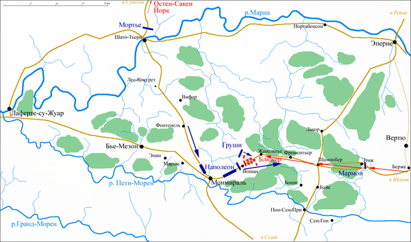 После разгрома Мармона Блюхер собирался ударить в тыл Наполеону, который по его планам должен преследовать корпуса Йорка и Сакена. Блюхер не знал о том, что эти корпуса после боя под Шато-Тьерри были отброшены за Марну.
