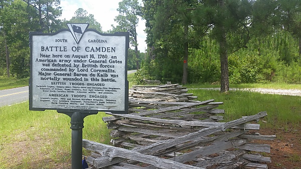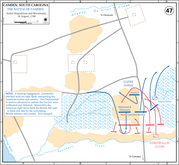 После капитуляции Чарльстона и пленения генерала Линкольна Конгресс назначил генерала Горацио Гейтса новым командиром армии Юга. Гейтс принял под своё командование бригаду Континентальной армии и несколько соединений ополченцев, и с этими силами начал наступать на город Кэмден, надеясь разбить там небольшой британский отряд. Узнав о его наступлении, генерал Корнуоллис выступил из Чарльстона с армией в 2100 человек, и неожиданно столкнулся с армией Гейтса в сосновом лесу севернее Кэмдена. Сражение было недолгим: британские регулярные части сразу же обратили в бегство ополченцев, после чего континентальные полки попали в окружение и были почти полностью уничтожены. На поле боя погиб генерал Де Кальб. Остатки армии отступили в Шарлотт и Хиллсборо, а Корнуоллис смог начать наступление в Северную Каролину. Разгром при Кэмдене положил конец карьере Горацио Гейтса, которому более не доверяли командование армией. В лице Гейтса Джордж Вашингтон лишился своего последнего политического противника.