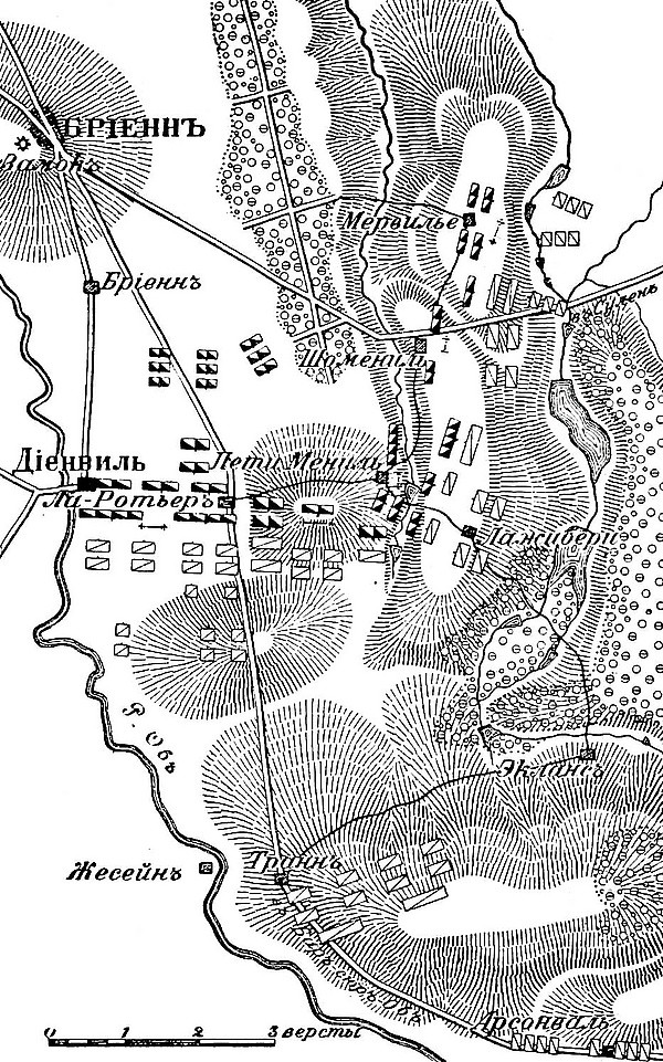 - Правый фланг Наполеона опирался на деревню Диенвиль на реке Об, обороняемую 7-тысячным корпусом Жерара.