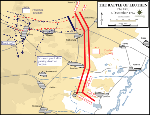 Уступая австрийцам численно, Фридрих решает применить, как при Колине, тактику т. н. «косой атаки». Часть прусской пехоты начала фронтальную атаку, при этом Фридрих умело имитирует подготовку к атаке на правый фланг противника. В это время происходит скрытный манёвр: за прикрытием холмов прусские колонны незаметно движутся в южном направлении. Прежде, чем австрийцы успевают разгадать замысел противника, Фридриху удаётся создать против их левого фланга подавляющее численное превосходство. Кроме того, на левом фланге австрийские силы состояли, в основном, из протестантов, сочувствовавших Пруссии.