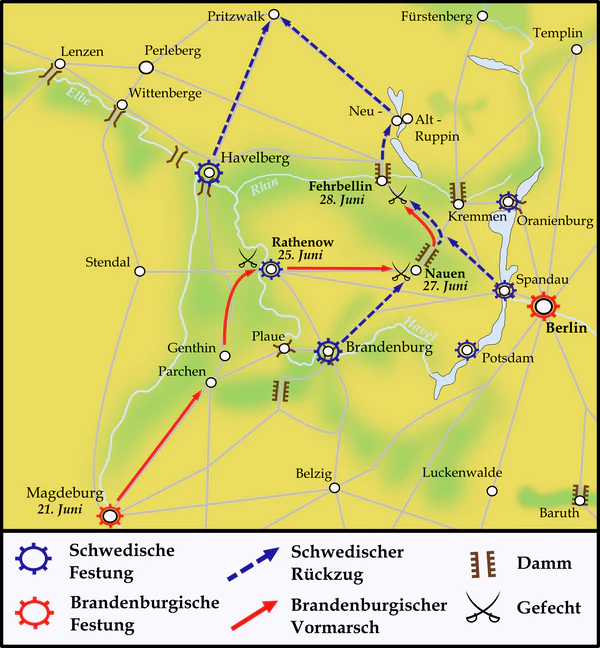 17 июня бранденбуржцы настигли шведский арьергард, состоящий из 1000 всадников у плотины перед Науэном, напали на него и нанесли огромный урон. Однако на другой стороне плотины шведы заняли настолько хорошо укрепленную позицию, что без пехоты взять её было невозможно. Тем не менее, шведы не стали дожидаться подхода немецкой пехоты и в ночь на 18 июня отправились далее к Фербеллину.
