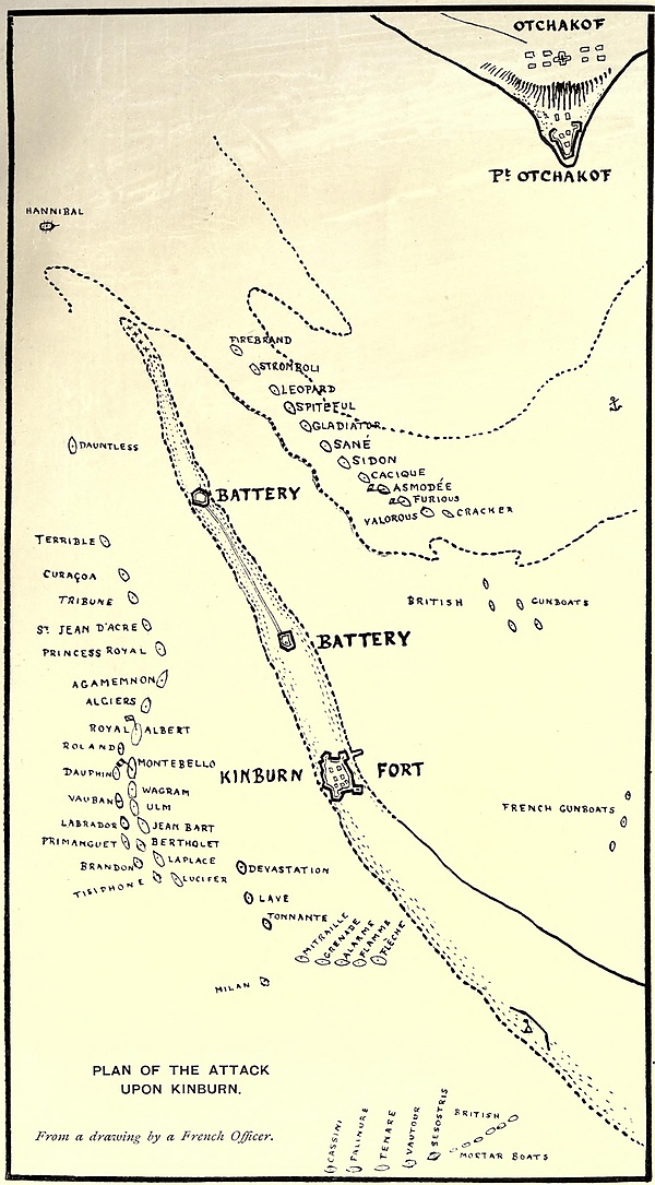 6 (18) октября в 9.00 французские плавучие батареи подошли к южной стороне Кинбурна на расстояние около четырёх кабельтовых и открыли огонь. Все фрегаты союзной эскадры расположились на юго-западном траверзе и принялись прямой наводкой громить цитадель. Вместе с артиллерией Кинбурн обстреливали из винтовок находившиеся на плавбатареях французские морские пехотинцы[4].