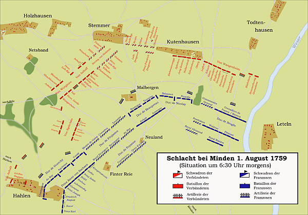 В 6 часов утра Союзная армия была готова к бою: на крайнем правом фланге находилась английская (14 эскадронов) и ганноверская (10 эскадронов) кавалерия под командованием лорда Сэквилла, к ней примыкала пехота, соединённая в 4 колонны, по 6 и по 8 батальонов, каждая в два эшелона, между корпусом Вангенхайма на левом фланге и пехотой правого фланга находились ещё 15 эскадронов смешанной, в основном, прусской кавалерии. У французов в это время лишь корпус де Бролье завершил построение, генералы маршала Контаде строили и перестраивали свои части, словно забыв о том, что перед ними находится противник, до 8 утра, французские солдаты продемонстрировали при этом плохую выучку.
