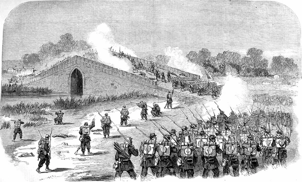 Командовавший цинскими войсками Сэнгэринчи стал лично командовать обороной моста. Ближайшие к мосту строения и пагоды были заняты пехотой, артиллерия (в том числе орудия большого калибра) обстреливали мост, берег канала и прибрежные заросли были заняты стрелками. Французская пехота приближалась к мосту постепенно, пользуясь укрытиями, отвечая на огонь противника; тем временем французы подтянули свою артиллерию. В течение получаса продолжался артиллерийский бой. Несмотря на то, что китайские начальники показывали своим подчинённым пример храбрости, техническое превосходство французских войск оказалось решающим: перекрёстный огонь перебил почти всю прислугу при орудиях.
