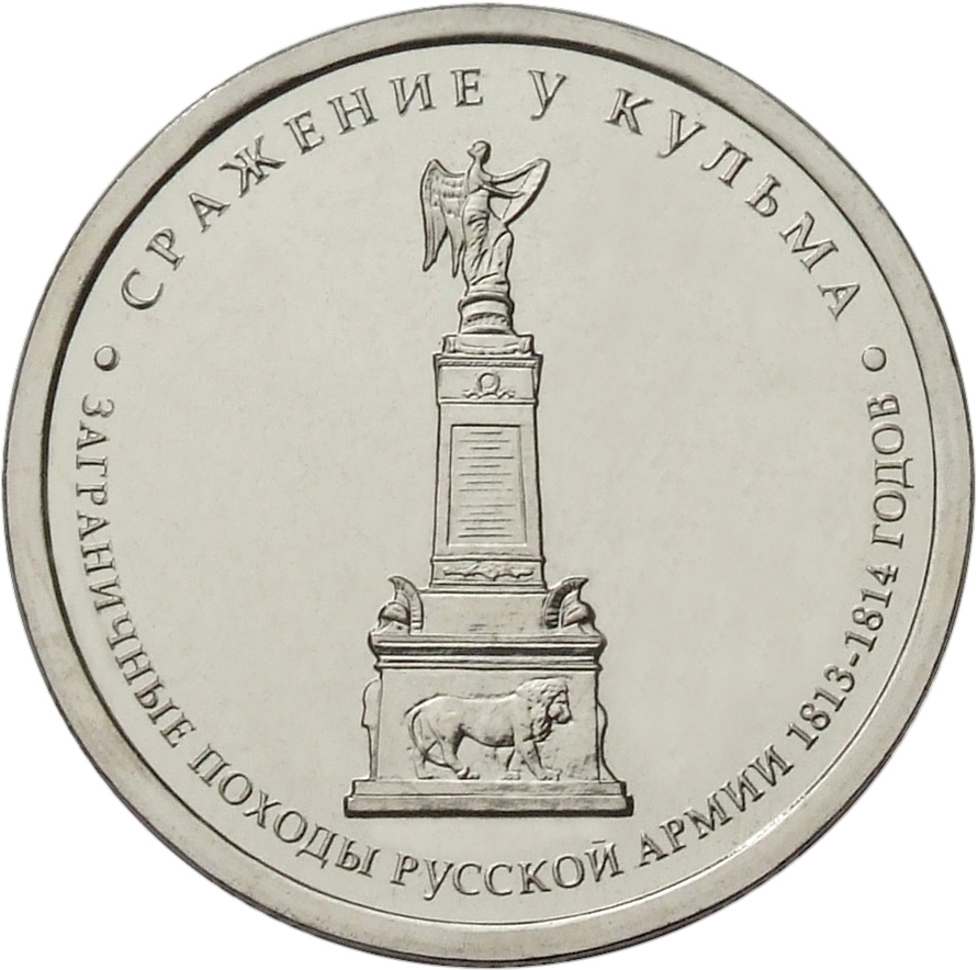 | В центре диска — рельефное изображение памятника, установленного близ места сражения, вдоль канта по окружности — надписи, разделённые двумя точками, вверху: «СРАЖЕНИЕ У КУЛЬМА», внизу: «ЗАГРАНИЧНЫЕ ПОХОДЫ РУССКОЙ АРМИИ 1813—1814 ГОДОВ». |