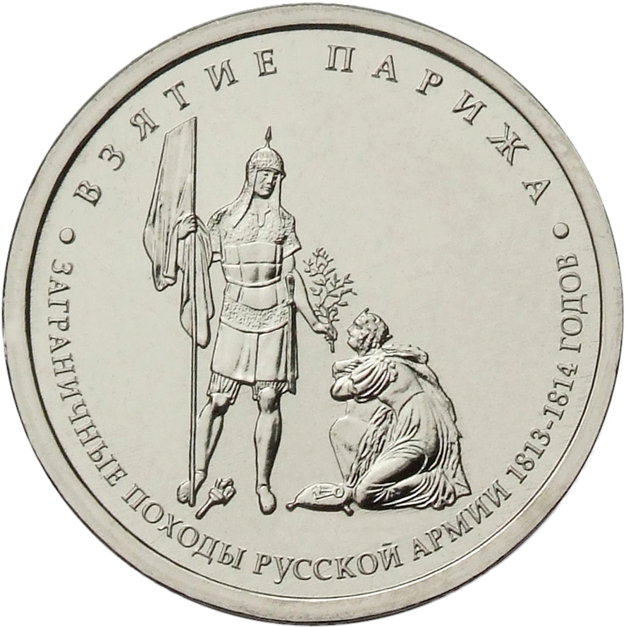 | В центре диска — рельефное изображение аллегории «Покорение Парижа. 1814» с медальона Ф. П. Толстого, вдоль канта по окружности — надписи, разделённые двумя точками, вверху: «ВЗЯТИЕ ПАРИЖА», внизу: «ЗАГРАНИЧНЫЕ ПОХОДЫ РУССКОЙ АРМИИ 1813—1814 ГОДОВ». |