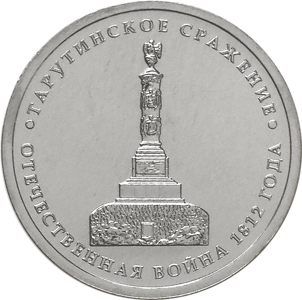 | В центре диска — рельефное изображение памятника героям Отечественной войны 1812 года, вдоль канта по окружности — надписи, разделённые двумя точками, вверху: «ТАРУТИНСКОЕ СРАЖЕНИЕ», внизу: «ОТЕЧЕСТВЕННАЯ ВОЙНА 1812 ГОДА». |