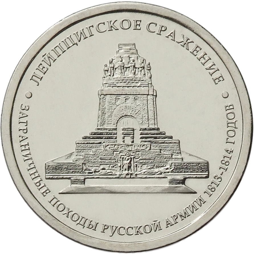 | В центре диска — рельефное изображение монумента «Битва народов» в Лейпциге, вдоль канта по окружности — надписи, разделённые двумя точками, вверху: «ЛЕЙПЦИГСКОЕ СРАЖЕНИЕ», внизу: «ЗАГРАНИЧНЫЕ ПОХОДЫ РУССКОЙ АРМИИ 1813—1814 ГОДОВ». |