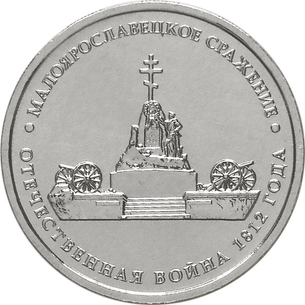 | В центре диска — рельефное изображение памятника героям Отечественной войны 1812 года, вдоль канта по окружности — надписи, разделённые двумя точками, вверху: «МАЛОЯРОСЛАВЕЦКОЕ СРАЖЕНИЕ», внизу: «ОТЕЧЕСТВЕННАЯ ВОЙНА 1812 ГОДА». |