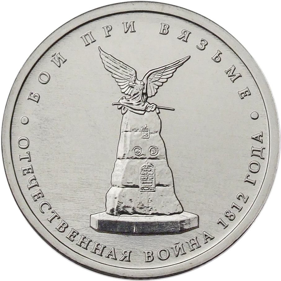 | В центре диска — рельефное изображение памятника героям Отечественной войны 1812 года, вдоль канта по окружности — надписи, разделённые двумя точками, вверху: «БОЙ ПРИ ВЯЗЬМЕ», внизу: «ОТЕЧЕСТВЕННАЯ ВОЙНА 1812 ГОДА». |