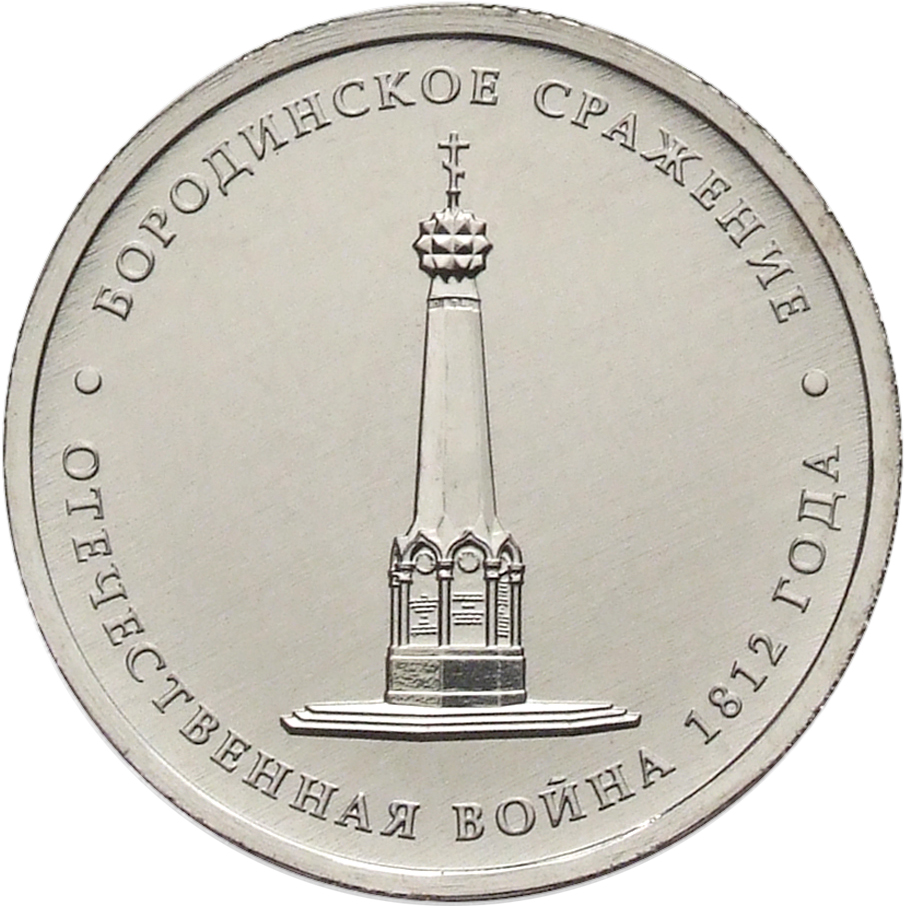 | В центре диска — рельефное изображение памятника героям Отечественной войны 1812 года, вдоль канта по окружности — надписи, разделённые двумя точками, вверху: «БОРОДИНСКОЕ СРАЖЕНИЕ», внизу: «ОТЕЧЕСТВЕННАЯ ВОЙНА 1812 ГОДА». |