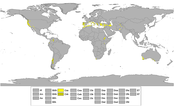Помимо Средиземноморского бассейна средиземноморский климат наблюдается в значительной части Калифорнии (Большая Калифорнийская долина и на побережье от Сан-Франциско до границы с Мексикой), в Западно-Капской провинции в ЮАР, центральной части Чили, прибрежных районах на юге Западной Австралии (район города Перт) и на полуостров Эйр в Южной Австралии.