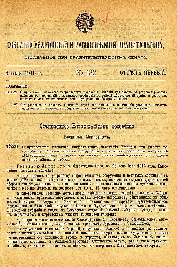 В связи с большими потерями на фронте и отсутствием трудового резерва в тылу, 25 июня (8 июля) 1916 года император Николай II подписал указ о привлечении инородческого мужского населения империи в возрасте 19-43 лет к работам по строительству оборонительных сооружений и военных коммуникаций. 8 (21) июля 1916 года на основе императорского указа генерал-губернатор Туркестанского края издал распоряжение о начале трудовой мобилизации первой очереди (мужчины 19-31 года)[14].