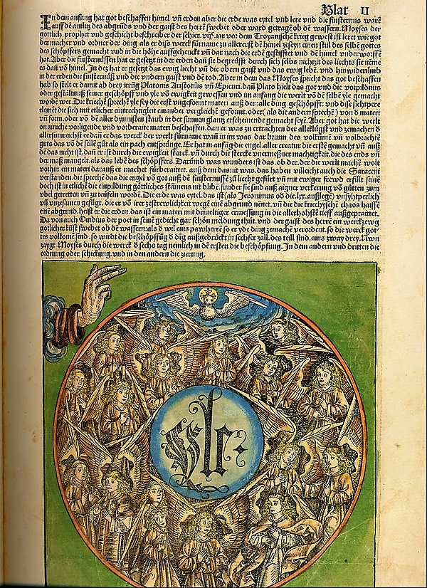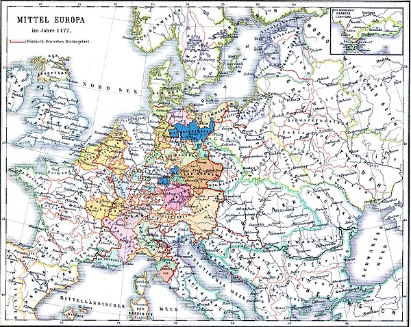 Авторами частных хроник в Германии с XIV века были почти исключительно представители патрициата и купечества. Таковы «Книжка о моём роде и моих похождениях» Ульмана Штромера за 1371—1407 годы и аугсбургская хроника Гектора Мюлиха — зятя Якоба Фуггера. Это, собственно, не хроника как таковая, а упорядоченный по хронологии частный архив, содержащий налоговые списки, строительные расчёты, постановления городского совета. Частные патрицианские хроники создавались в Ульме, Регенсбурге, Кёльне, Франкфурте, Майнце и других вольных и имперских городах[177]. Для дальнейшего историописания Священной Римской империи существенную роль сыграло изобретение книгопечатания, которое стимулировало создание единой истории всей немецкой нации. При дворе Максимилиана I огромное внимание привлекло издание «Германии» Тацита в 1470 году, и стимулировало деятельность гуманистов Эльзаса, которые считали несомненной тесную связь германского и римского миров, но не их тождественность. Своеобразное выражение эта тенденция получила в Epitome rerum Germanicarum, начатой Себастьяном Мурхо (скончался в 1495 году), законченная Якобом Вимпфелингом и вышедшая в свет в 1505 году. Н. Керскен характеризовал её как «инспирированную педагогическими и патриотическими интересами»[178]. Очень своеобразным памятником историографии является Нюрнбергская хроника Шёделя, который учился в Падуанском университете и имел прямое отношение к итальянскому гуманизму. Однако хронику он построил по средневековым лекалам, расположив материал по смене четырёх царств и шести возрастов, причём нынешний — шестой, закончится пришествием Антихриста. Священной Римской империи и теории «трансляции империи» была посвящена отдельная глава. Хроника была напечатана в 1493 году как роскошное издание с 2000 иллюстраций, что способствовало её известности[179].