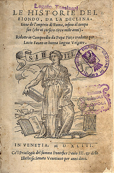 Тосканская гуманистическая историография может быть обозначена как политико-риторическая. Во многом её представителям противостояла римская гуманистическая традиция, которая подготовила систематическую критику исторических источников и лежала в основе антикварианизма[157]. Труды Флавио Бьондо не пользовались большой репутацией среди современников, поскольку он не знал греческого языка, а его сочинения не отличались изяществом языка и отделанностью стиля[158]. Антикварные работы Бьондо были посвящены восстановлению античной топографии Рима и итальянских провинций. Его трактат «Торжествующий Рим» (1460) стал первым систематическим описанием государственных и частных, военных, гражданских, религиозных учреждений древних римлян, обычаев, одежды и прочего. По замечанию О. Вайнштейна, для позднейшей историографии этапным стал труд Бьондо «Три декады историй от падения Римской империи» (Historiarum ab inclinatione Romanorum imperii decades), охватывающий события от 412 по 1440 годы. Он, таким образом, первым выделил период истории, близкий по хронологическим границам современному пониманию Средневековья и стал первым европейским медиевистом[159]. Сам термин он ещё не использовал, равным образом, его хронология была популяризирована лишь в XVII веке Христофором Келлером. Разделение истории на древнюю, среднюю и современную сделал Джованни Андреа Бусси в 1469 году в речи, посвящённой недавно почившему Николаю Кузанскому[160]. Впрочем, в объяснении причин падения Римской империи Бьондо оставался человеком своего времени: главной причиной была Божья кара, как из-за гонений язычников на христиан, так и из-за гордыни императоров, перенесших столицу в Константинополь, и удушивших древние свободы и гордость римлян. Бьондо широко пользовался средневековыми компиляциями, особенно Винсента из Бове и Мартина из Троппау[161]. «Декады» стали одной из первых книг, напечатанных после основания типографий в Италии[162]. Дальнейшее развитие эрудитской истории античности и критического метода было представлено в сочинениях ученика Бьондо Помпония Лето[163].