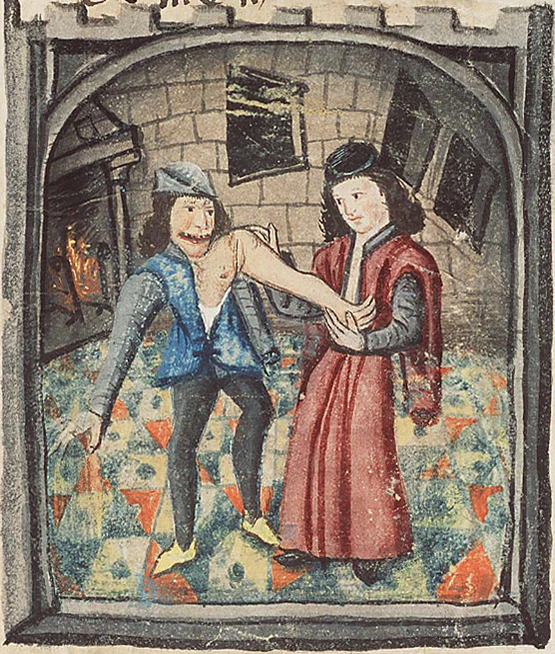 В эпоху Средневековья одним из самых популярных методов лечения практически любого заболевания было кровопускание. Его корни уходят в древнегреческую медицину: знаменитый античный врач Гален считал, что все болезни (в том числе и психические) — следствие дисбаланса четырех жидкостей в организме. К ним относили кровь, флегму, желтую желчь и черную желчь[32]. Традиционными процедурами европейских врачей также были пиявки и вскрытие вен.