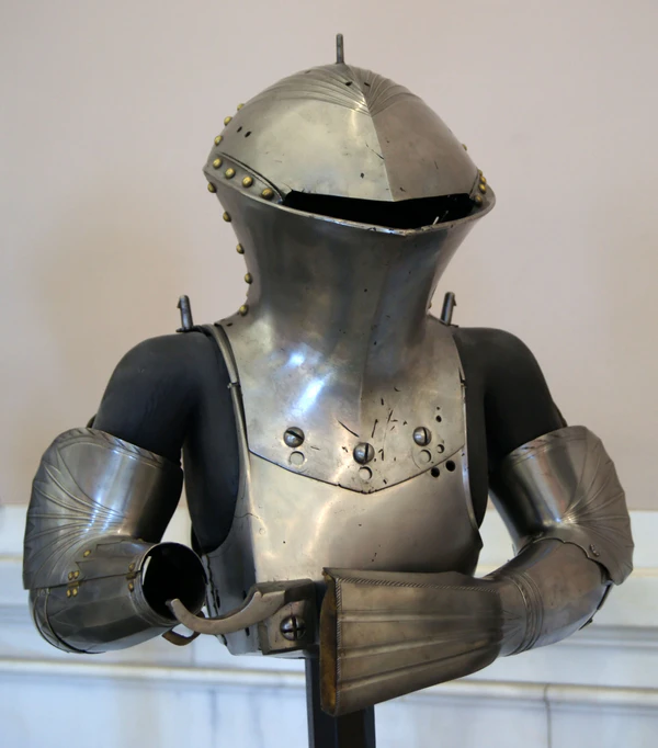 Латные доспехи покрывали всё тело. Хотя уже в 1250 году некоторые части тела были покрыты латами, например, наголенниками для защиты коленей и набедренниками — пластинами, защищавшими локти[31], первый полный комплект доспехов без тканевых элементов появился примерно в 1410—1430 годах[32]. Средневековые доспехи, составлявшие полный комплект, состояли из кирасы, горжета, наголенников, перчаток, набедренников, поножей и сабатонов, скреплённых внутренними кожаными ремнями. Усовершенствованное оружие, такое как арбалеты и длинные луки, значительно увеличило дальность стрельбы и мощность. Это значительно упростило и сделало более распространённым пробивание кольчуги[33]. К середине XV века большинство доспехов состояло из одних пластин, без поддоспешника.