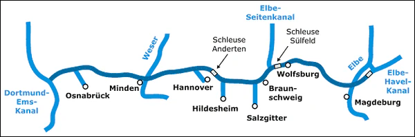 Основные порты: Ганновер (грузооборот 1,6 млн тонн в 1973), Зальцгиттер-Беддинген(1,6 млн тонн), Мисбург (1,2 млн тонн), Хильдесхейм (1,0 млн тонн), а также Пейне (0,7 млн тонн), Брауншвейг (0,8 млн тонн), Оснабрюк (0,7 млн тонн). С 1965 производится модернизация канала и строительство Эльбского обводного канала (канал Север — Юг) от Вольфсбурга на севере к Гестахту в низовьях Эльбы.[1]
