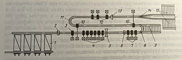Более продвинутой и эффективной технологической схемой (по сравнению с агрегатами линейного типа) располагали полунепрерывные среднесортные станы. Например, стан 350 состоит, как правило, из 14 или 15 двухвалковых клетей (10 горизонтальных и 4—5 вертикальных), которые расположены на трёх параллельных линиях.