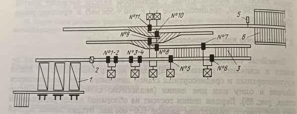 Среднесортные станы линейного типа считаются в настоящее время устаревшей конструкцией. Они обычно имели в своём составе 5—6 клетей, расположенных в две линии[3]. Для таких станов также практиковалась схема технологического процесса с «шахматным» расположением чистовых клетей. При этом 6 черновых клетей дуо размещались на одной линии, ещё одна промежуточная клеть располагалась отдельно, а 4 чистовые клети с попарным приводом устанавливались в шахматном порядке со смещением на одну бочку валка. Такая оригинальная конструкция позволяла существенно сэкономить рабочее пространство цеха за счёт небольшого числа клетей и возможности прокатки более крупных профилей, но жёсткая кинематическая связь пар чистовых клетей с единым приводом затрудняла составление оптимальной калибровки валков, а необходимость реверса направления прокатки сильно ограничивала её скорость до не более 7 м/с[6].